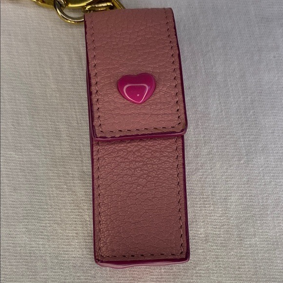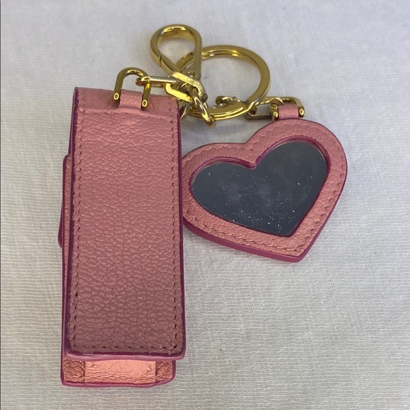 This Miu Miu Logo Mirror & Lipstick Bag Charm / Key Chain in Pink Leather is in excellent preowned condition.