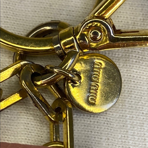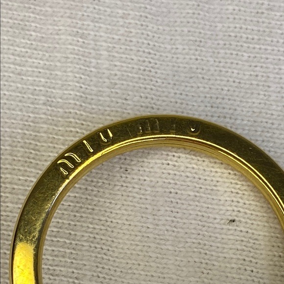 Hallmarks: "Miu Miu" in goldtone metal on the mirror. "Miu Miu" engraved on goldtone ring. "Miu Miu" on a round, goldtone charm
