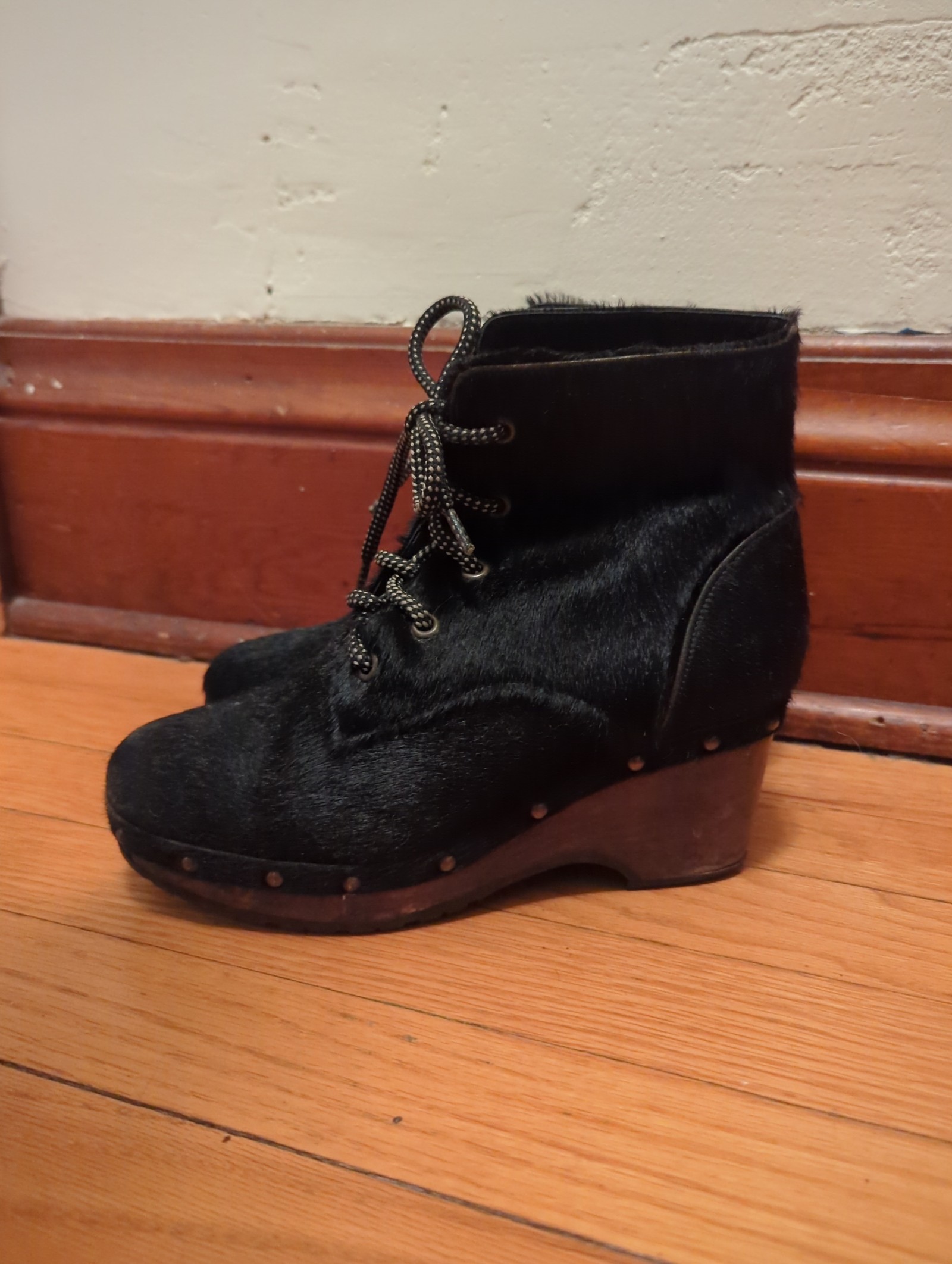 Rounded toe/Ankle height/wide black and white laces/seaming at heal counter/antiqued bronze studs on self strip around bottom edge of shoe/3” wooden heal/1.25” platform/leather insole/treaded rubber sole/black/100% pony. Wear shown in photos