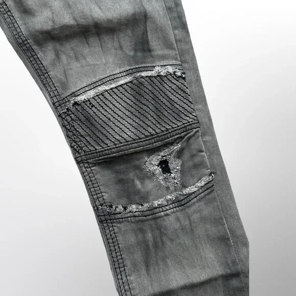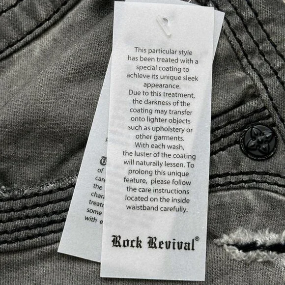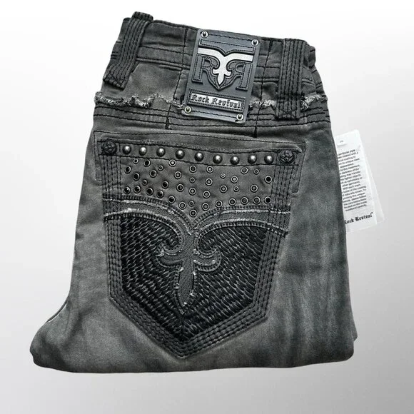 Rock Revival Men's Embellished Armory Biker Jeans NWTStyle # TM6641k1A, faded wash define laid-back jeans constructed from soft stretch denim for easy-wear comfort.Zip fly with button closureFive-pocket style88% cotton, 12% polyester, 2% elastaneMachine wash, tumble dryDistressedEmbellishedImportedMeasurements are approx jeans lying flatSize 30Waist 15.5"Rise 10"Inseam 34"Size 38Waist 19.5"Rise 11.5"Inseam 34"Customer Service Policy: We are not an expert on everything we sell, so some of our knowledge may be limited. As for shoes and clothing on manufactures overall fit Items are retail store purchases and may have been handled or tried on by store customers Prior to sending, photos are taken of item with shipping label and a zip tie tag attached to represent the item purchased and shipped