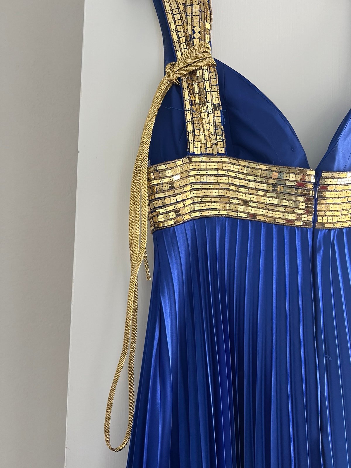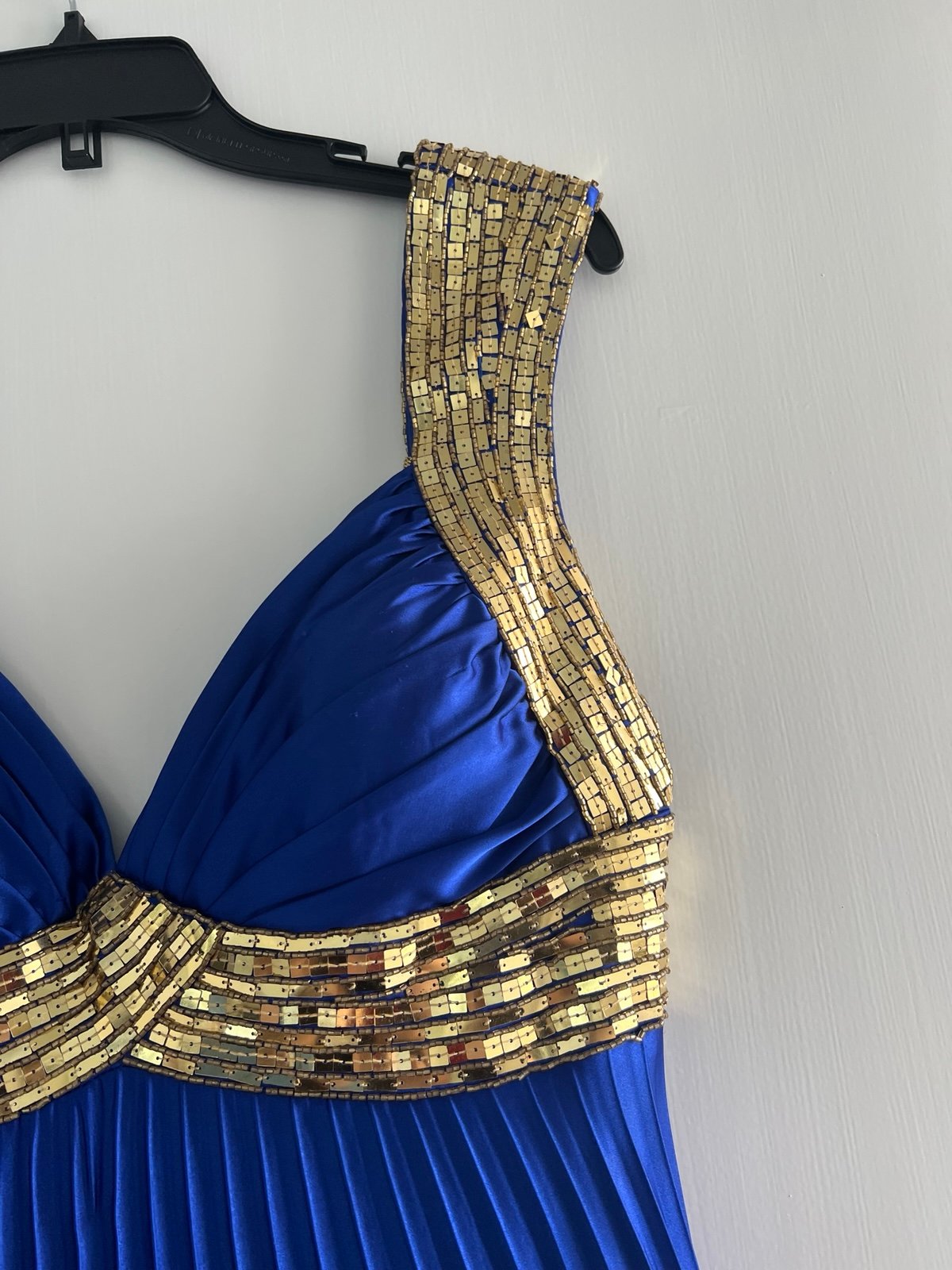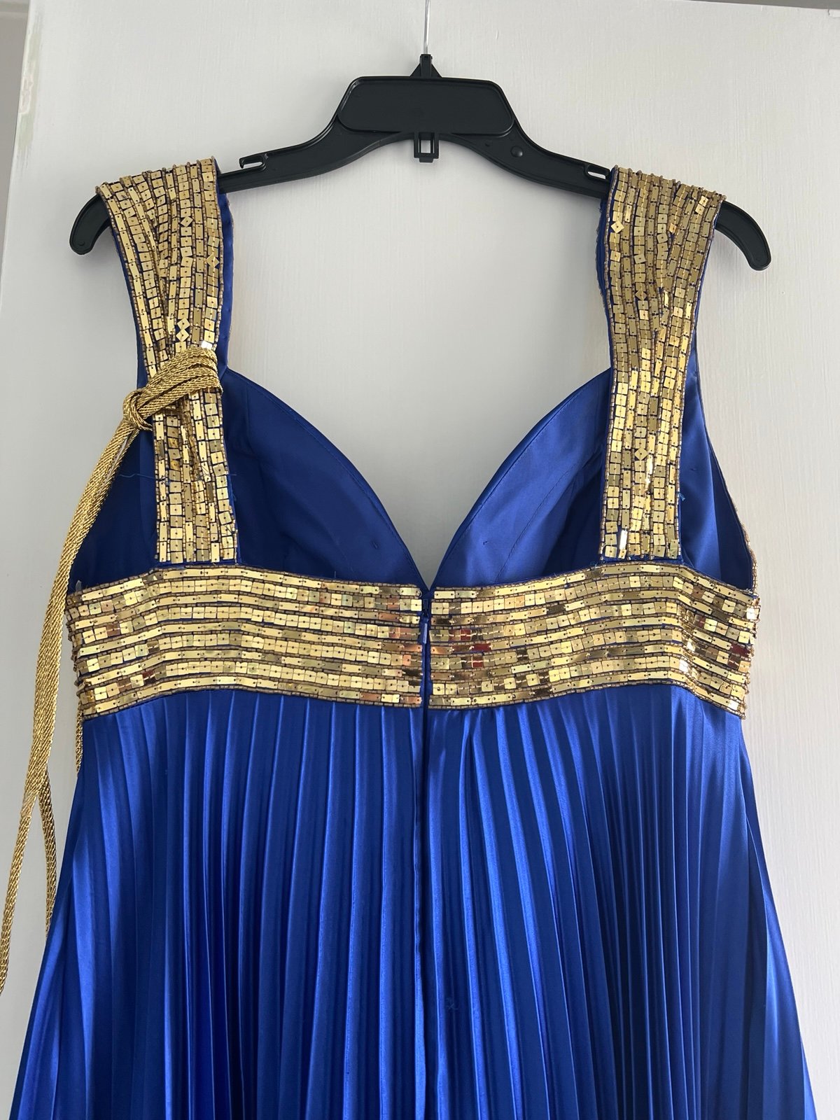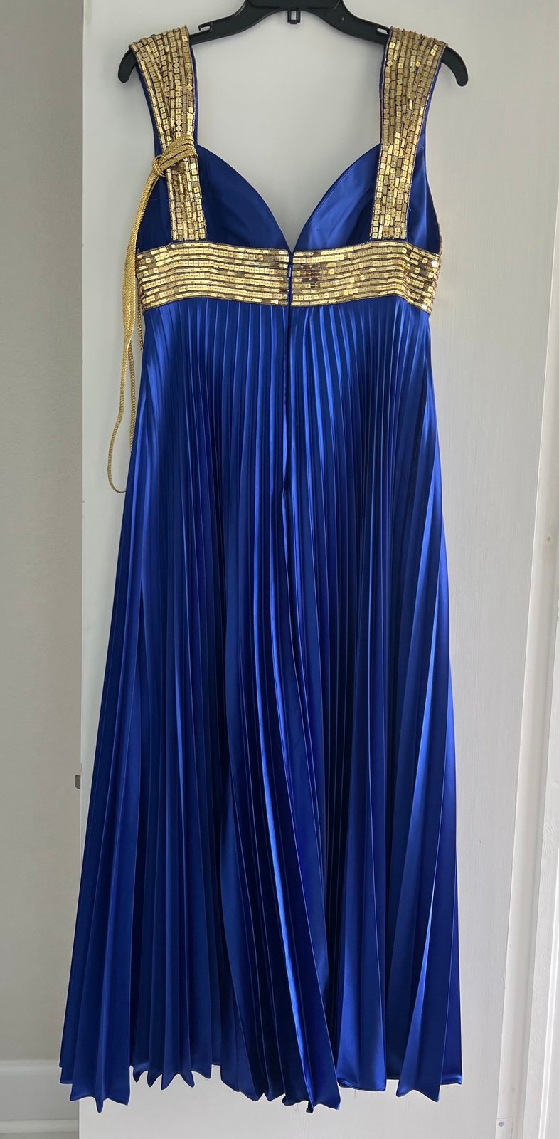 Gorgeous Tiffany designs cobalt blue dress with gold beads. Size 10 very very flattering fit excellent condition may be missing a couple beads in the top left shoulder. See pictures, but honestly, you would never really notice it and they could be easily replaced some frame inside of the headline which just needs to be cut out, but outside looks great. Also has removable gold belt that can be worn as a belt or tied in the back or even as a necklace.